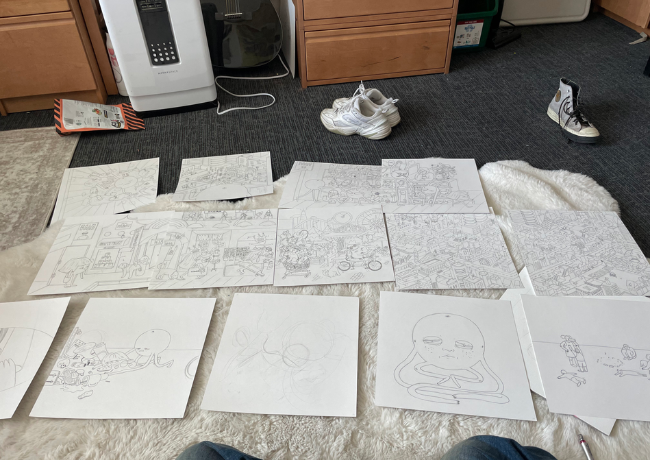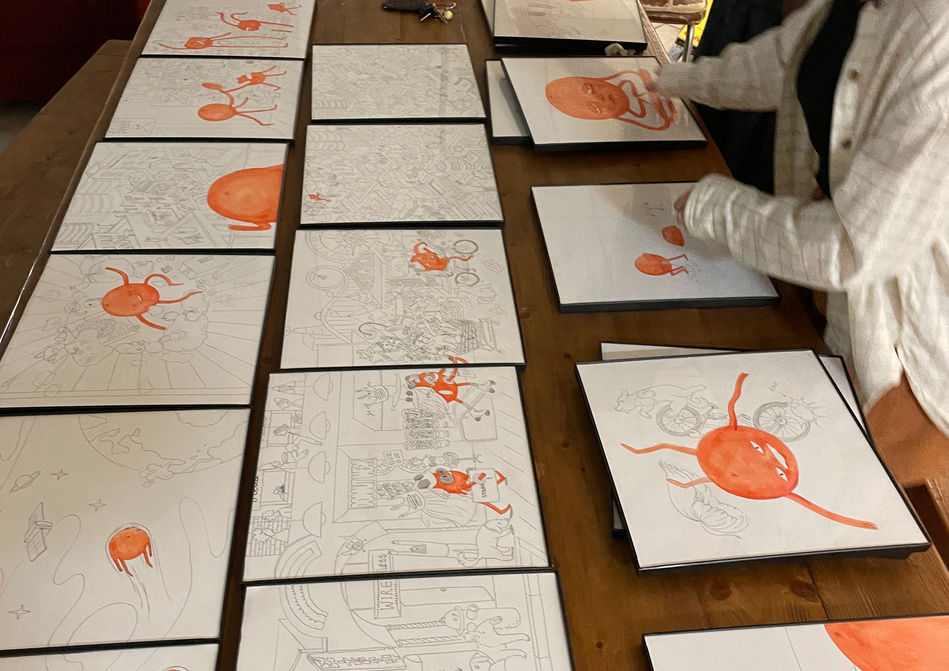 Then it became a children's book, which is what you see on the wall. Rima Makaryan, Arbitrary Ink's founder, and I were in charge of translating all of that story into the final product. I designed the characters and Rima designed the spaces. Then, it was pretty much just being wholed up in a room and frantically drawing until we were too exhausted to keep doing it anymore.